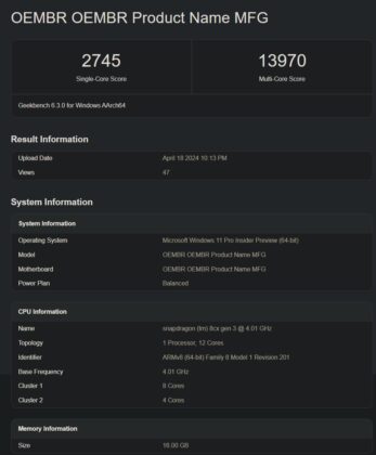That’s not the first time Microsoft has faked the CPU in the benchmarks, and it’s all part of the anti-leak measures. The benchmarked device in question is the Surface Laptop 6 running Snapdragon X Elite 12-core chip with 16GB of RAM, NPU, and Windows 11 version 24H2.